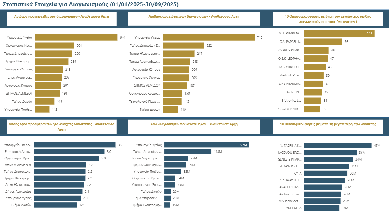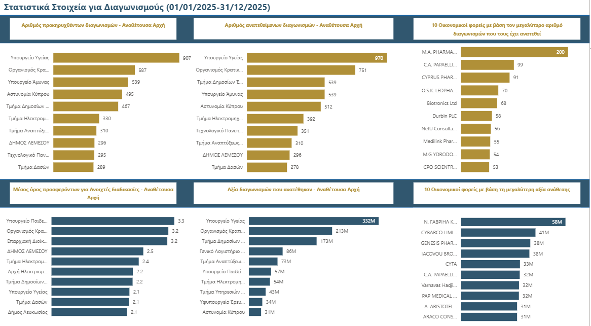 Μπορείτε να δείτε στατιστική ανάλυση για διαγωνισμούς που δημοσιεύτηκαν στο Ηλεκτρονικό Σύστημα Δημόσιων Συμβάσεων eProcurement από την 1η Ιανουαρίου 2019 μέχρι σήμερα. Δείτε τους περιορισμούς όσο αφορά την ποιότητα και πληρότητα των στατιστικών στοιχείων πατώντας εδώ.